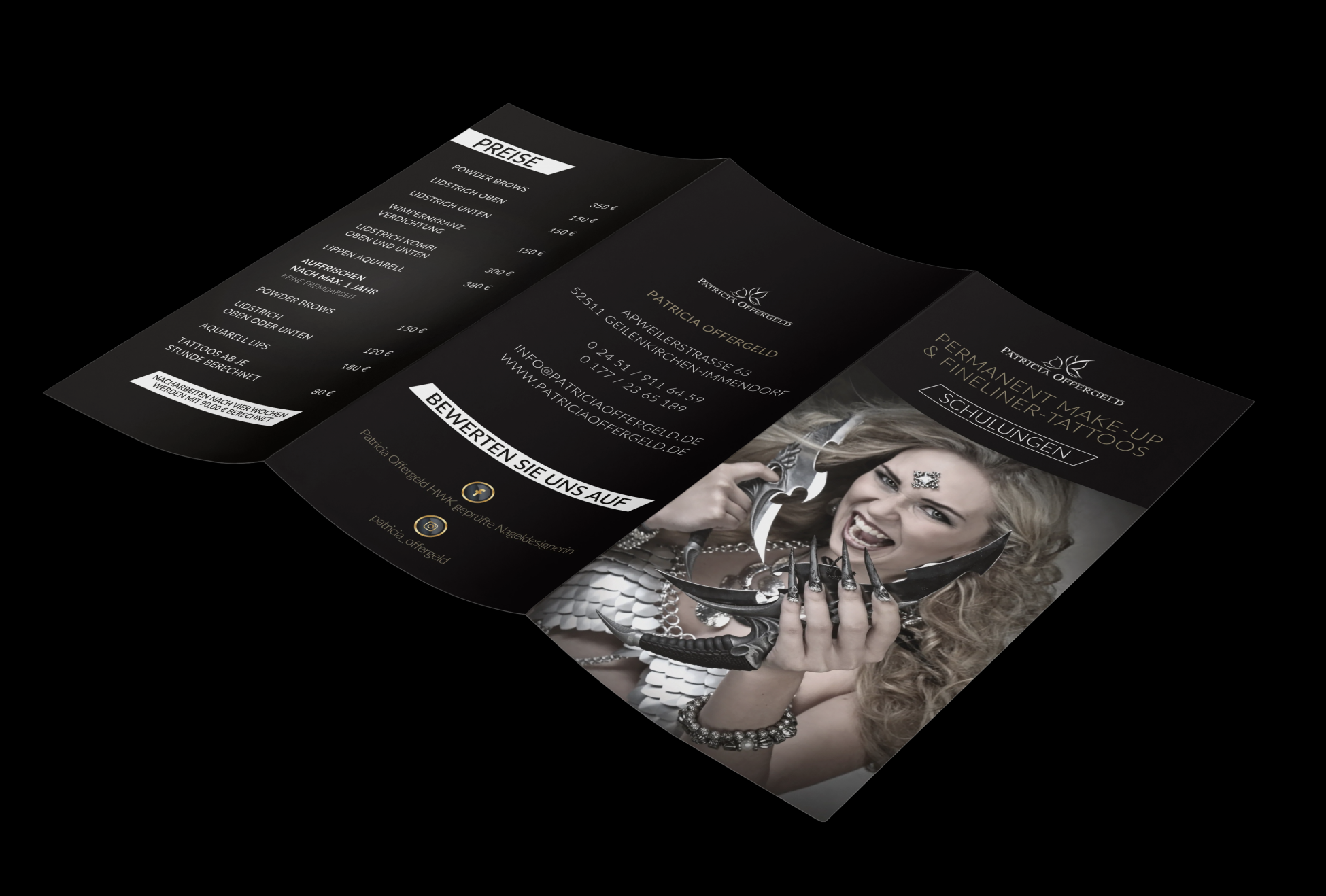 Patricia Offergeld Exhibition & Print Flyer & Prospekte Gestaltung diverser Preislisten als Falzflyer in DIN lang. Patricia Offergeld Exhibition & Print Flyer & Prospekte Gestaltung diverser Preislisten als Falzflyer in DIN lang. Werbebanner visitenkarten